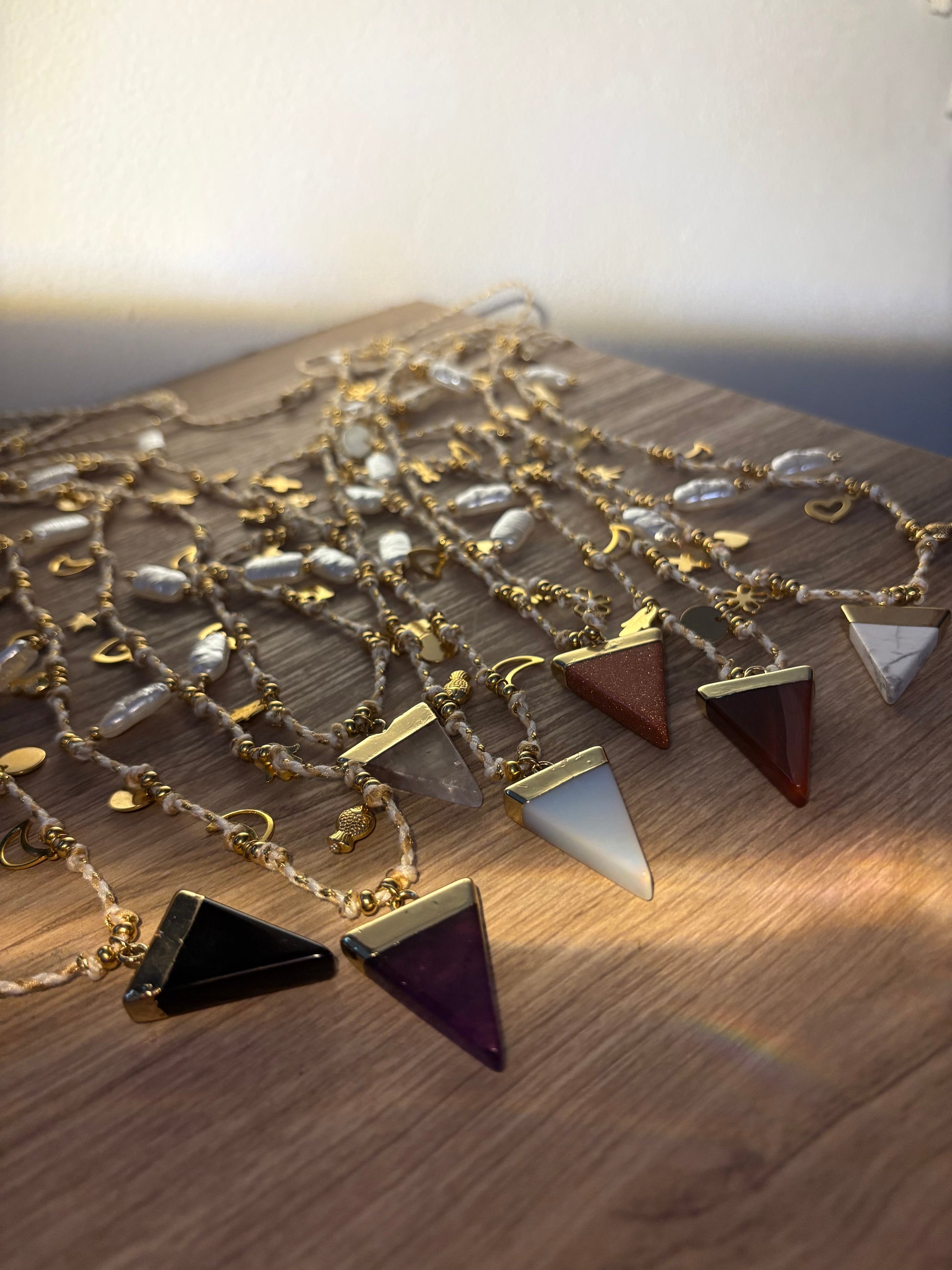 Charms en baño de oro, perlas y cuarzo en forma de triángulo.